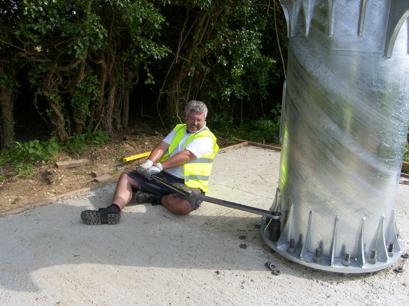 The tower flexed a fair bit due to its own weight when horizontal and light could be seen through the flanges between section 2 and 3 despite the bolts being at full torque. Using the telehandler to bend the tower upwards, thus more than compensating for its own weight enabled the bolts to be given at least an extra half a turn, which then closed the flange gap. The situation was exacerbated by weld distortion mentioned above, but it raises the question as to what torque the bolts are really subjected to in service?